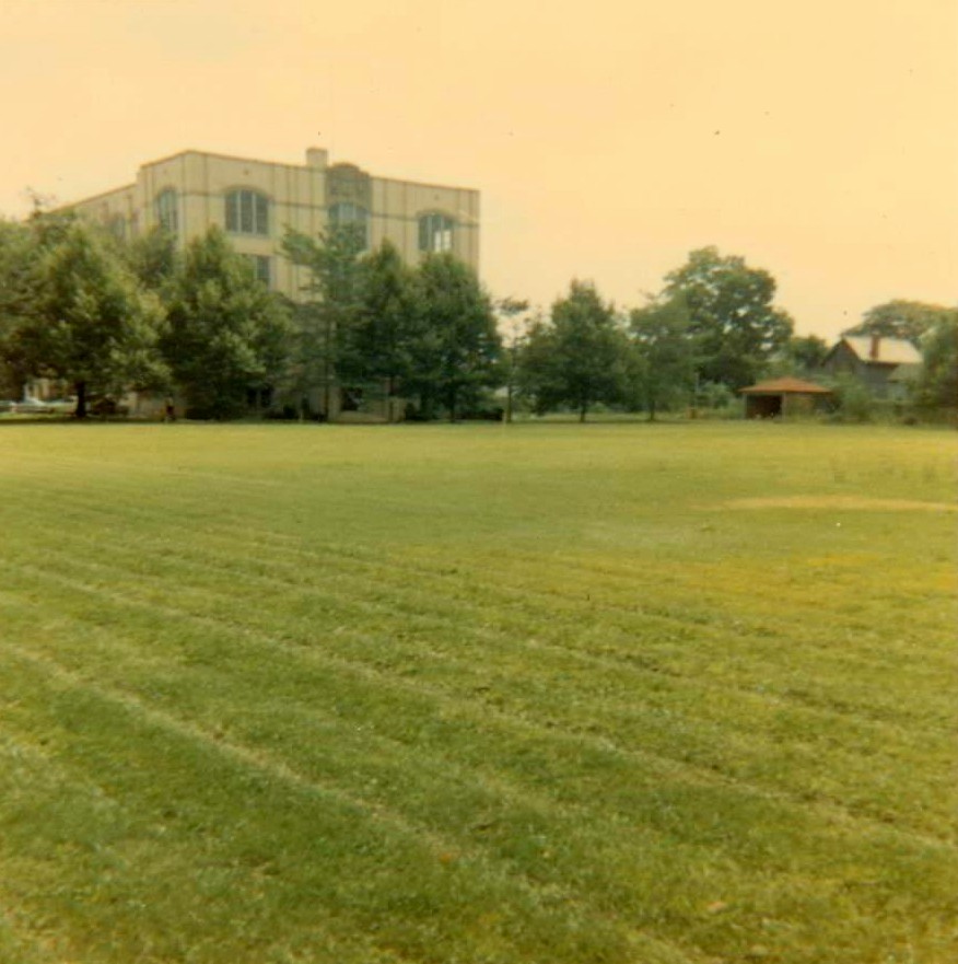 The view from the baseball field toward the newer building